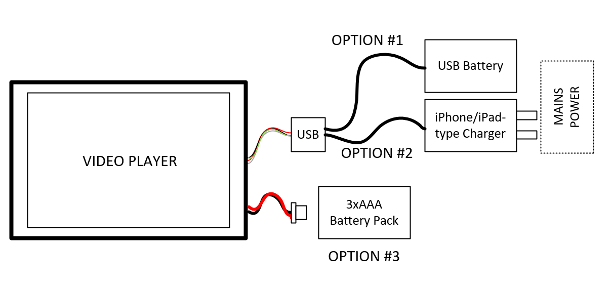 - The video player requires a strong 4.5-5-volt power source, such as a USB battery bank, that is capable of generating enough power to charge a tablet or smartphone. If using the supplied 3xAAA battery pack, make sure to use fresh batteries, and do not use rechargeable batteries-- these are not able to generate the amount of power required.