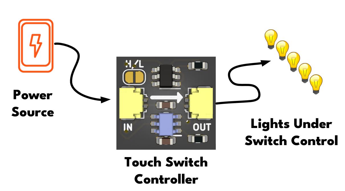 Touchswitch with Cables Control Pack. The touch switch is a true "off" switch, meaning that almost no power is consumed when in the off state. This makes it ideal for use with battery-powered setups where you want to be sure battery power is not being consumed when power is off.